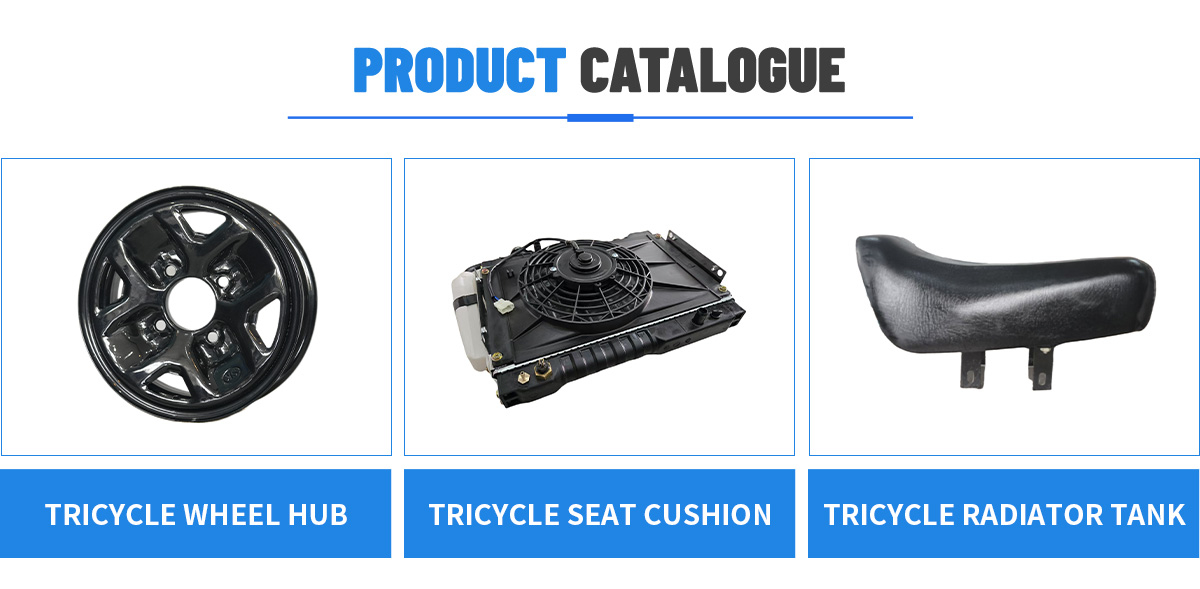 Productos principales:Cubo de rueda de triciclo, radiador de triciclo, cojín de asiento de triciclo, tanque de combustible de triciclo, filtro de aceite de triciclo